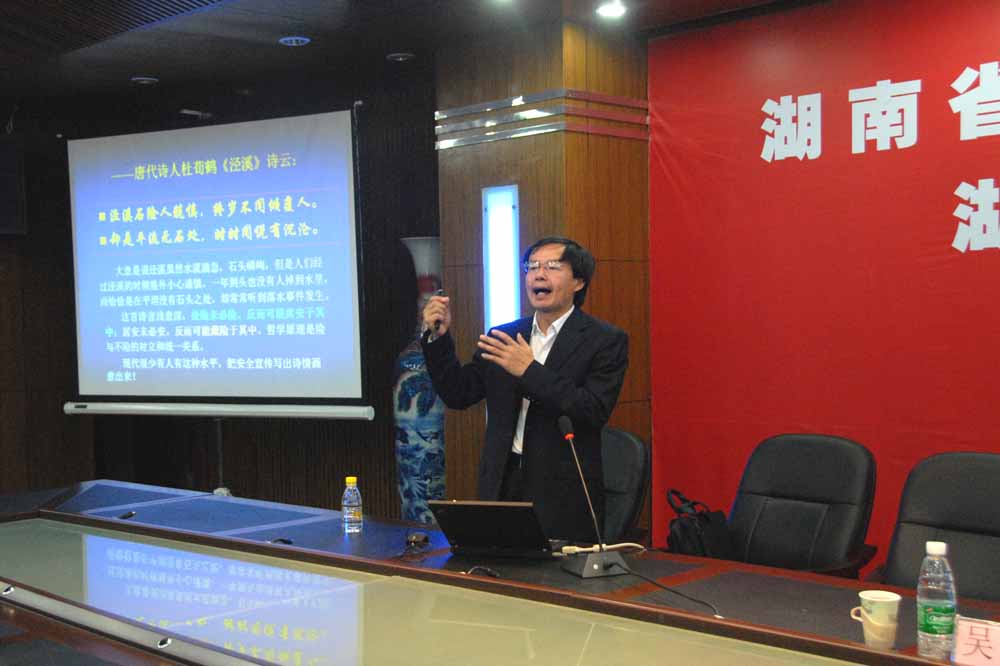 吴超教授从领会安全与安全文化内涵、理解安全文化与和谐社会关系、推广和传播安全文化、弘扬和发展安全文化,学习先进安全文化精髓四个方面阐述了如何实现和谐社会。吴教授还介绍了中南大学举办的全校性的“安全文化活动周”活动相关情况,并以图片与视频展示活动精华,希望广大学生积极参与到安全文化的推广与传播中来,为构建和谐社会与安全校园贡献力量。