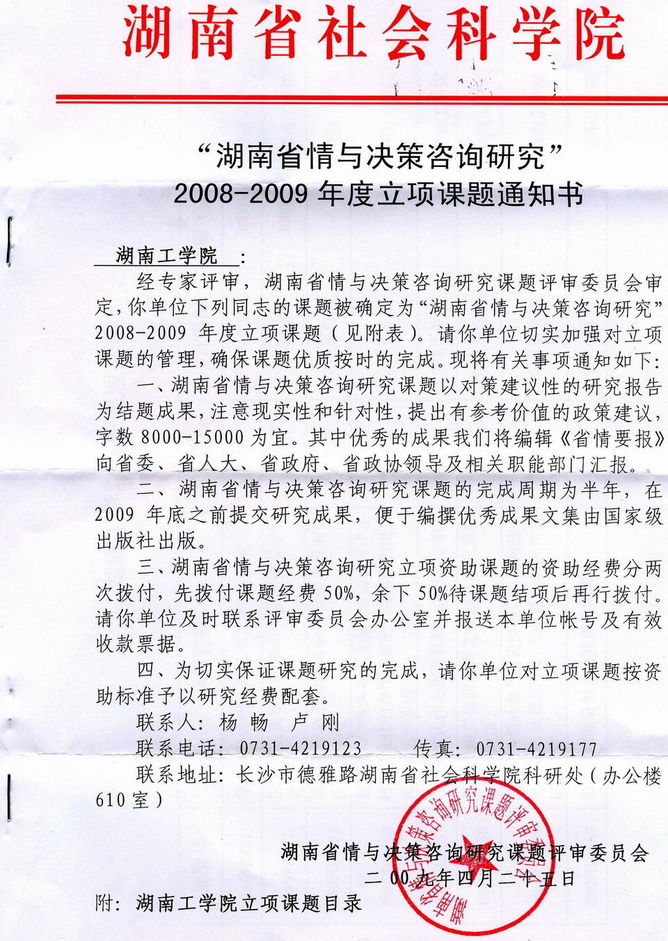“湖南省情与决策咨询研究”2008-2009年度立项课题通知