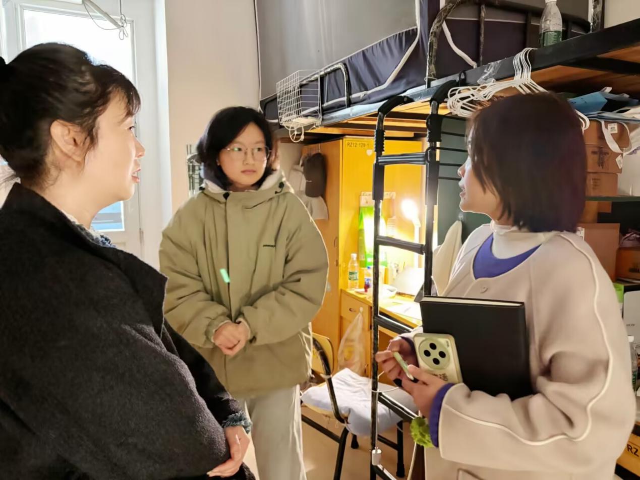 走访过程中,老师们逐间走访学生寝室,与同学们亲切交谈,细致询问大家的课程学习进展及生活适应情况。谢忠祥重点查看了用电规范、消防隐患及卫生状况,提醒学生务必做到人走断电、人走上锁,及时消除各类安全隐患,保持宿舍环境整洁有序。傅娜详细询问了同学们的假期生活收获与新学期学习规划,鼓励大家快速调整状态,以饱满热情投入到新学期的学习生活中。任静则针对插排私拉乱接、违规电器使用等安全隐患进行了全面排查,提醒同学们杜绝侥幸心理,守护好自身与他人的生命财产安全。