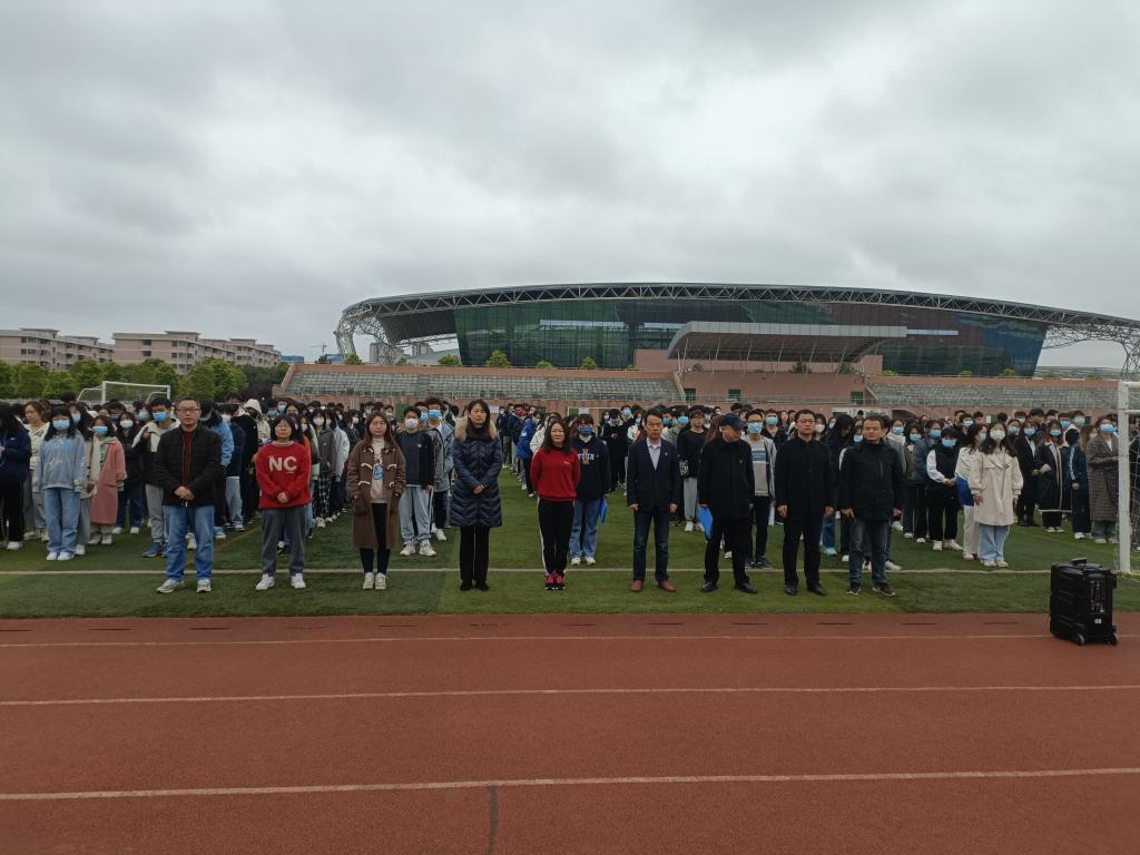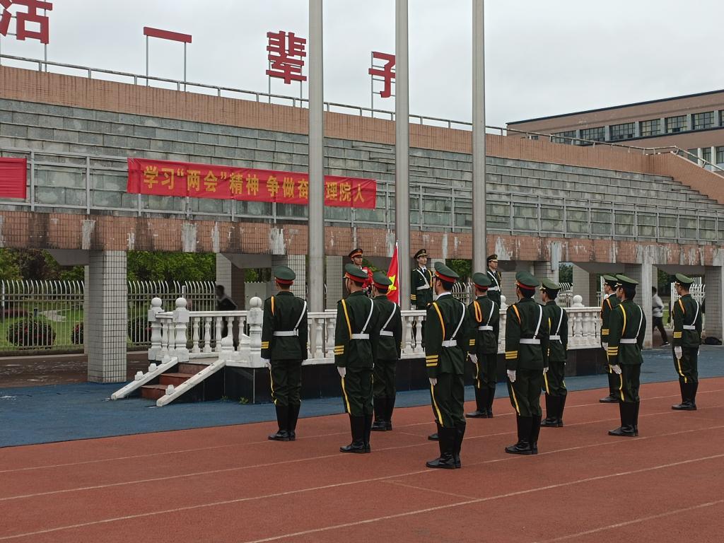 为进一步加强全院师生深入贯彻习近平新时代中国特色社会主义思想,学习践行“两会”精神,理学院于3月21日7:30在北田径场隆重举行“学习‘两会’精神 争做奋斗理院人”主题升旗仪式。院党委书记宁清平、院长刘璟忠、党委副书记何雪华、副院长谢忠祥、副院长邓元祥、组织员刘恒、学工办主任张艳霞、辅导员旷惠琦、全体班主任及理学院全体学生参加此次升旗仪式。