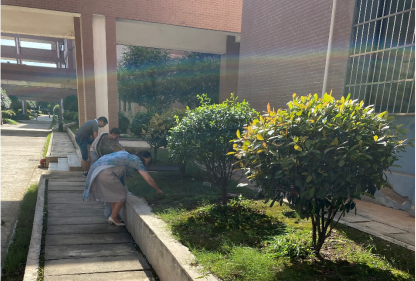 在活动开始前,学院分工会为同志们分发了卫生工具,支部书记对活动需要完成的主要事项——清除数理楼周边杂草进行了分工,大家纷纷撸起袖子,投入到热情的劳动之中,整个劳动现场热情高涨,炎热的天气丝毫没有影响到同志们的干劲。经过党员们近一个小时的辛勤劳动,数理楼周围花坛和路边,以及停车位周围的杂草被拔除,花坛中、卫生死角等处所潜藏的垃圾也被一并清理干净,数理楼周围的绿化变得更加整洁美观。