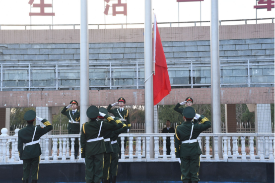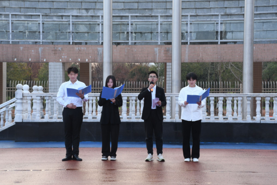 7点,升旗仪式准时开始,护旗手正步护送国旗至升旗台。国歌奏响,升旗手扬旗,五星红旗缓缓升起,全体师生行注目礼。之后,由统计2401李慧妍、统计2401魏宏运、物理2402高睿、物理2401刘秉鑫四位同学带领全体同学进行诗朗诵《以青春之名,筑强国之梦》。