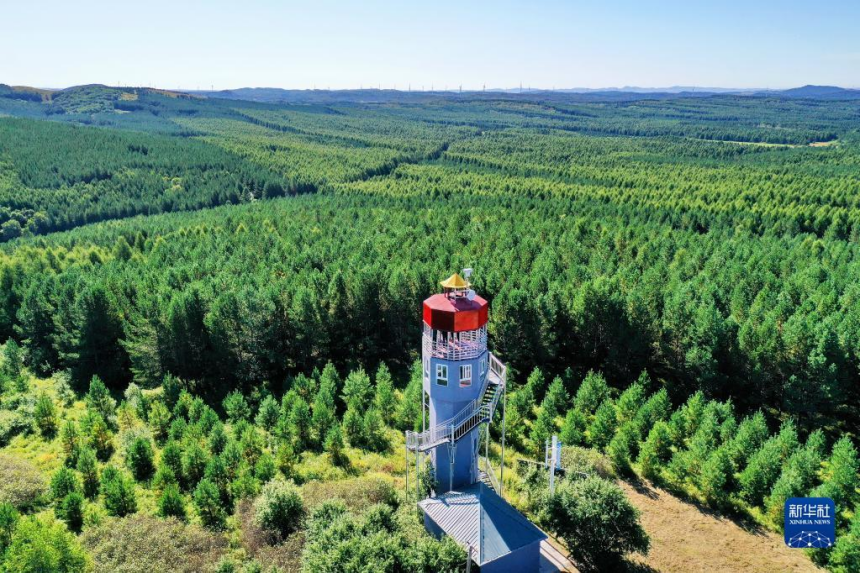 河北塞罕坝机械林场内的望海楼(2021年8月23日摄,无人机照片)。新华社记者 牟宇 摄