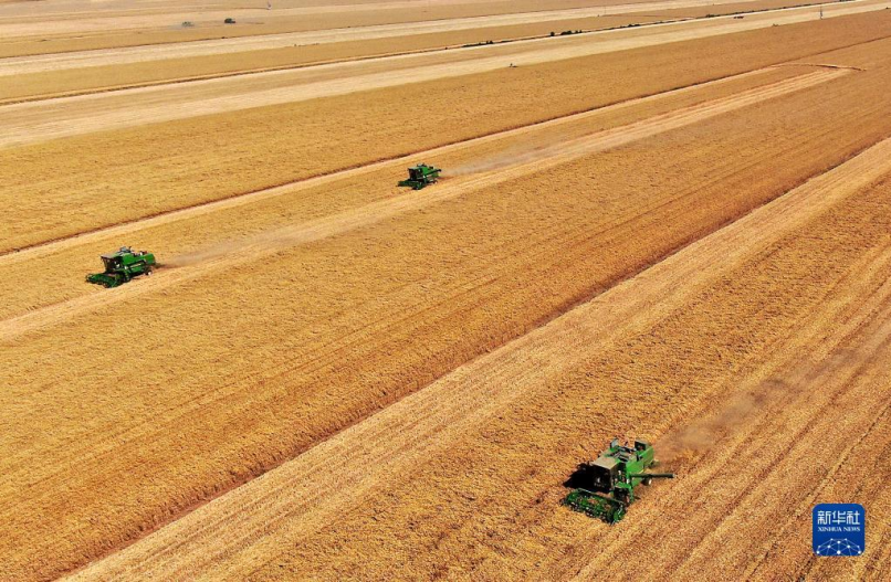 在河南省黄泛区农场九分场的麦田里,农机手操作收割机收获小麦(无人机照片,2021年6月6日摄)。新华社记者 李安 摄