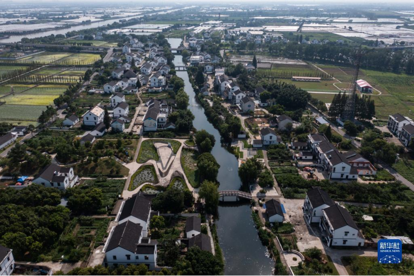 空中俯瞰浙江省嘉兴市嘉善县姚庄镇横港村(2021年7月12日摄,无人机照片)。近年来,嘉善县建设高标准农田14.8万亩;同时建设产业帮扶联合体、农业社会化服务综合体等,不断拓宽农民增收致富渠道,走出了一条城乡深度融合推动共同富裕的实践路子。新华社记者 徐昱 摄