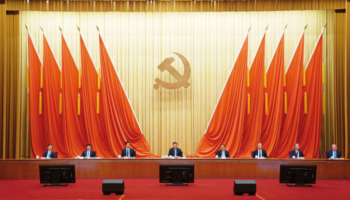 中国共产党第十九届中央委员会第六次全体会议,于2021年11月8日至11日在北京举行。这是习近平、李克强、栗战书、汪洋、王沪宁、赵乐际、韩正等在主席台上。 新华社记者 谢环驰/摄