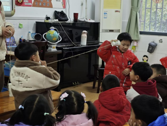 当鸡蛋随着盐粒的增加而浮出水面,小朋友们脸上都洋溢着笑容,两颗眼睛就像闪闪发光的星星;在纸杯电话实验区,小朋友们屏住呼吸,仔细地听着通过棉线传递来的声音;在浮沉子装置前,小朋友们反复上下按压瓶身,看玻璃管中的潜水员在液体升降沉浮……越来越多的小朋友开始积极踊跃地尝试。