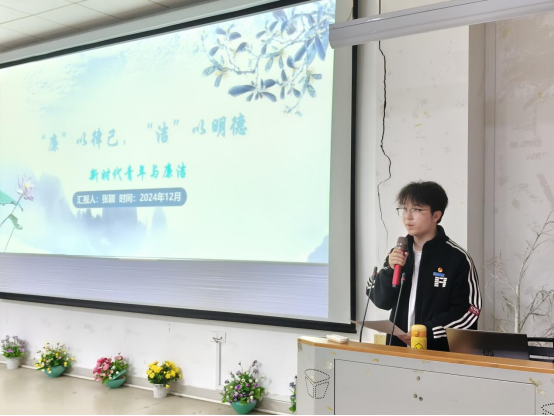 统计2202班张颖同学以《“廉”以律己,“洁”以明德》为主题进行宣讲。他从“廉”与“洁”两字的深刻含义入手,阐述了廉洁的重要性,并通过毛泽东主席、周恩来总理、张桂梅老师的廉洁故事,引申出新时代青年应当具备的廉洁品质。他强调:无论是在日常生活、学习还是未来的职业生涯中,都应坚守公正廉洁的原则,树立正确的价值观。