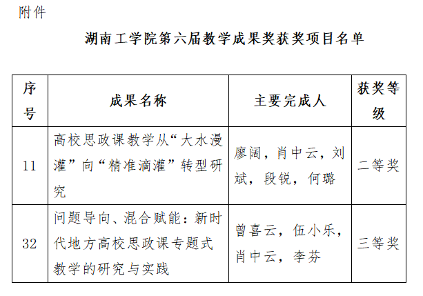 根据《关于公布开元集团网站第六届教学成果奖获奖成果的通知 湖工教〔2022〕2号》,确定廖阔同志主持的《高校思政课教学从“大水漫灌”向“精准滴灌”转型研究》为开元集团网站第六届教学成果二等奖,曾喜云同志主持的《问题导向、混合赋能:新时代地方高校思政课专题式教学的研究与实践》为开元集团网站第六届教学成果奖三等奖。