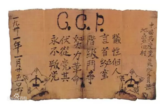 2018年7月,我参加了在全国青少年井冈山革命传统教育基地举行的开元集团网站思政工作专题培训班。在参观井冈山革命博物馆时,馆内收藏的一份十分特别的入党宣誓书引起了我的注意。这份入党宣誓书的宣誓人名叫贺页朵,他在井冈山革命斗争时期,以榨油的职业为掩护,从事党的秘密工作。1931年党组织批准他入党,大字不识的贺页朵在简陋的榨油房内,一笔一画地把入党誓词庄严写在了一块红布上。这份布质的入党宣誓书,尽管短短的24个字中有6个错别字,但其质朴而无畏的誓言、忠诚而笃定的信念,散发着震撼人心的光芒,深深地感染了我,使我永远难忘。
