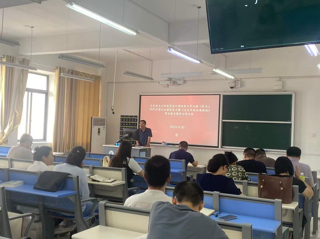 9月30日,马克思主义学院党总支理论学习中心组(扩大)2025年第九次集体学习暨《习近平谈治国理政》第五卷专题学习研讨在社科楼409智慧教室举行。党总支书记、院长张冬毛主持会议,党总支理论学习中心组成员、全体思政课教师参加。