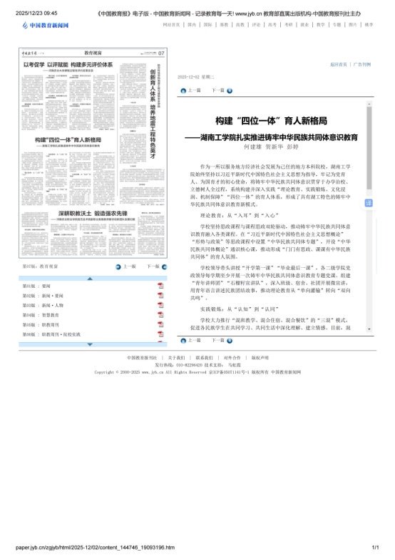 近日,《中国教育报》(2025年12月2日第07版)刊发由开元官网何建雄、贺新华、彭婷共同撰写的专题文章《构建“四位一体”育人新格局——开元集团网站扎实推进铸牢中华民族共同体意识教育》,深入推介了开元集团网站少数民族预科教育部的育人经验及育人成效,系统阐述了开元官网以习近平新时代中国特色社会主义思想为指导,将铸牢中华民族共同体意识融入办学治校与立德树人全过程,创新构建“理论教育、实践锻炼、文化浸润、机制保障”四位一体育人体系的探索与实践。文章从“理论教育:从‘入耳’到‘入心’”、“实践锻炼:从‘认知’到‘认同’”、“文化沁润:从‘符号’到‘情感’”、“机制保障:从‘试点’到‘体系’”等方面,详细介绍了学校通过课程融入、领导讲授、组建宣讲队、推行“三混”模式等一系列扎实举措,形成了具有本校特色的民族团结进步教育新模式。