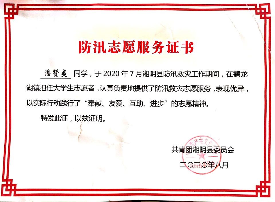 受持续降雨以及湘江上游来水影响,城西垸浩河口河道水位持续超警,防汛形势严峻。潘赞夷同学积极投身到巡河、守堤、排险、值班的防汛工作中。每天十个小时,在这期间,他需要在负责的堤坝范围内来回巡查,上到堤坝深处检查土壤松紧度状况,有无渗水缺口,对负责区域进行地毯式搜索,确保没有任何安全隐患。他提到这次经历不单单是一次志愿活动,更是对他锻炼自我,培养适应社会能力创造了条件。