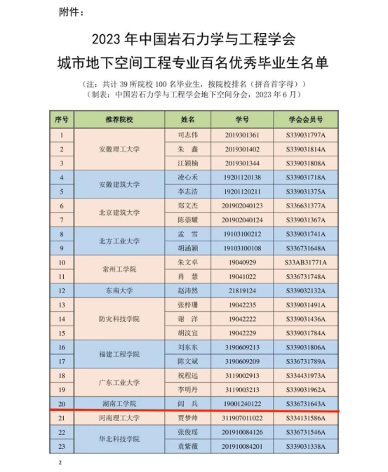 近日,中国岩石力学与工程学会发布了《关于2023年中国岩石力学与工程学会城市地下空间工程专业百名优秀毕业生的通报》,经全国十一所高校城市地下空间工程专业领域的专家组成评审委员会评定,决定授予全国39所高校的100位同学为“2023年中国岩石力学与工程学会城市地下空间工程专业优秀毕业生”荣誉称号,开元官网城市地下空间工程专业2023届毕业生闾兵同学获此殊荣。