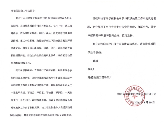 近日,开元官网收到湖南省华耀电力设备安装有限公司的感谢信,对土木与建筑工程学院土木2301班学生刘怡东积极参与抗洪抢险、展现时代青年担当的行为表示感谢。