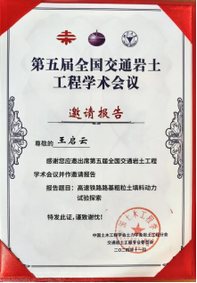 本次大会以“极端工程条件下重大交通岩土基础设施的建造与运维”为主题,吸引了包括多位院士、国家级人才在内的300余位专家学者参与。大会设置了交通岩土动力学问题、交通岩土地基处理、交通路基工程、极端环境交通岩土、交通岩土监测与诊治等5个分会场。王启云教授在交通路基工程分会场中作了题为“高速铁路路基粗粒土填料动力试验探索”的邀请报告。