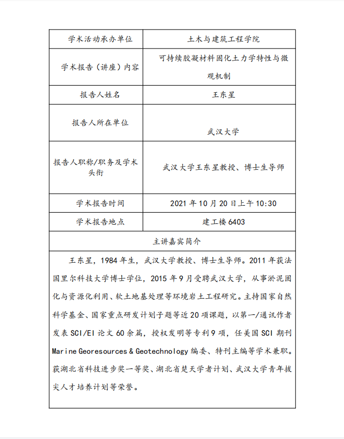 【讲座预告】可持续胶凝材料固化土力学特性与微观机制
