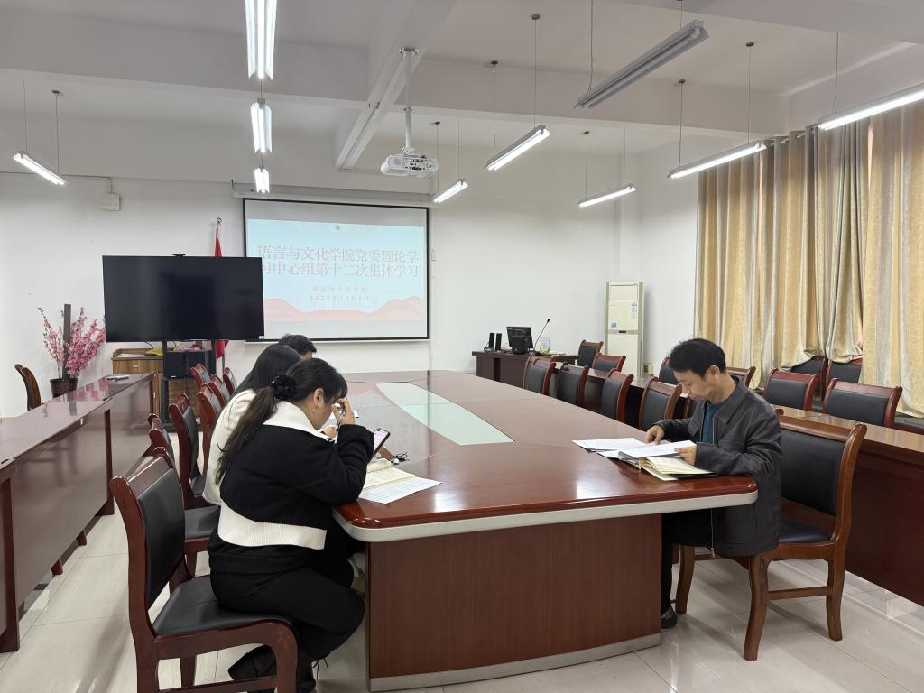 12月9日下午,学院党委理论学习中心组在外语楼317会议室举行2025年度第十二次集体学习。学院党委书记蒋志刚主持并作总结讲话,学院党委理论学习中心组全体成员参加了学习。