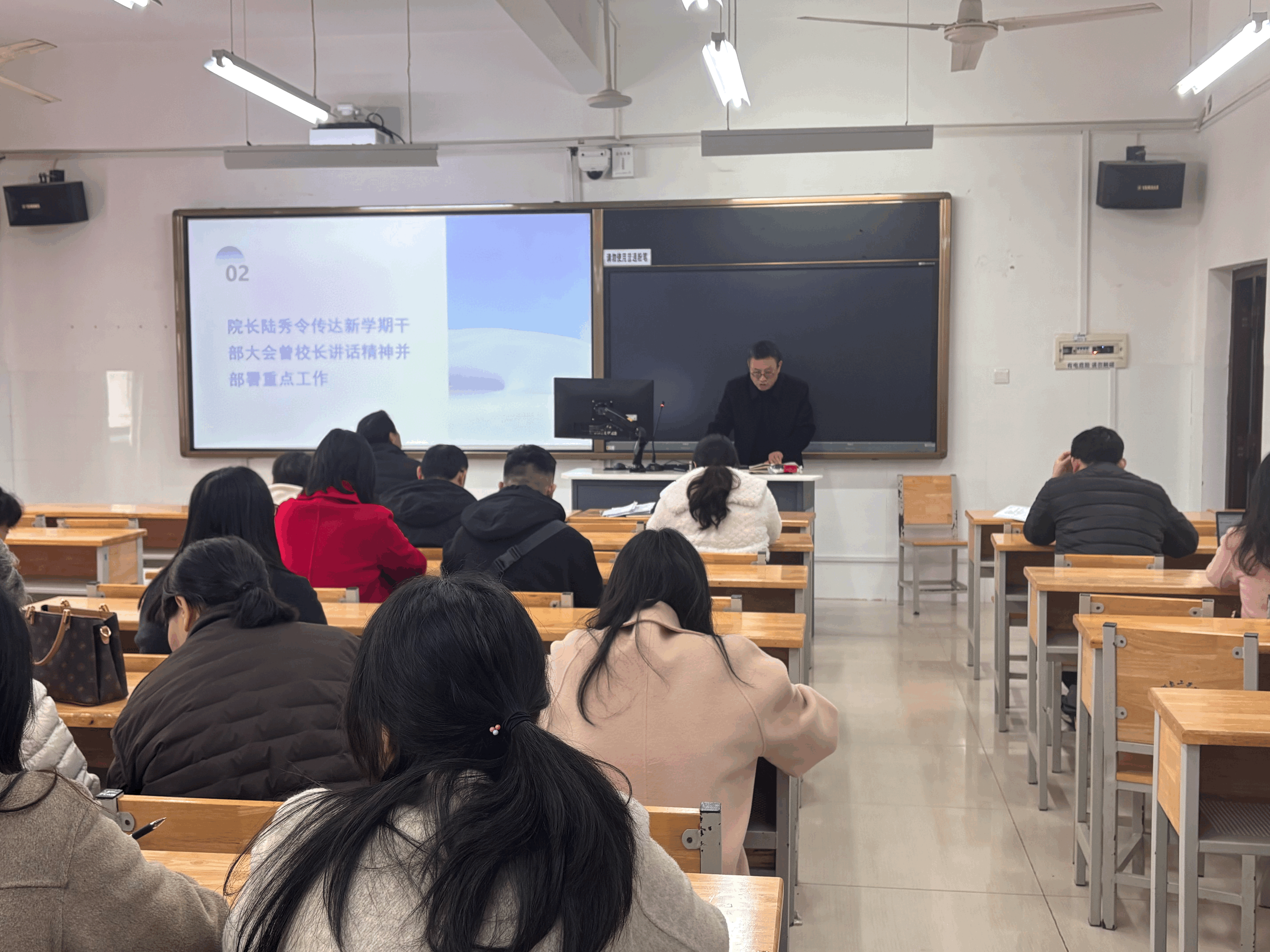 院长陆秀令传达了曾广胜校长在学校新学期干部大会上的讲话精神,围绕学科建设、专业发展、师资队伍、科学研究、人才培养等方面,对学院2026年的重点工作进行了部署,他强调,全院上下必须统一思想,聚焦学院中心任务,坚持目标导向与问题导向相统一,真抓实干,攻坚克难,确保各项任务落地见效。