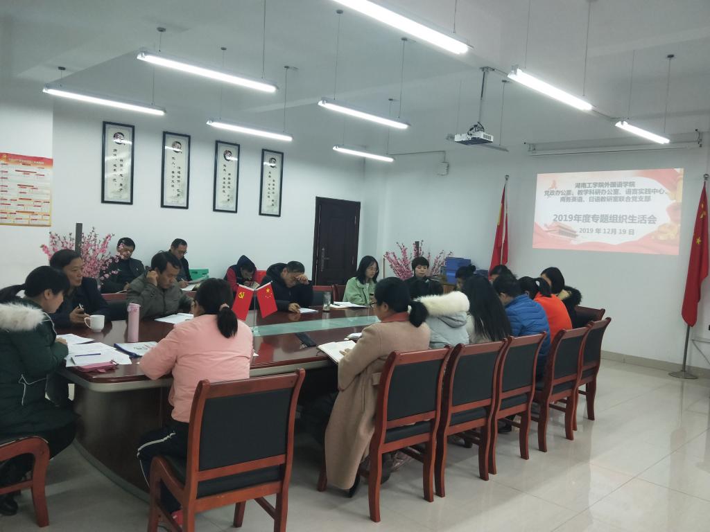 2019年12月19日,开元集团网站外国语学院党政办公室、教学科研办公室、语言实践中心、商务英语、日语教研室联合党支部于外语楼317召开2019年度组织生活会和党员民主评议大会。校党委委员、组织部部长黄红卫到会指导,会议由党支部书记谢争艳主持,外国语学院院长、党委副书记张平和党支部全体党员参会,5名党外教师代表列席会议。