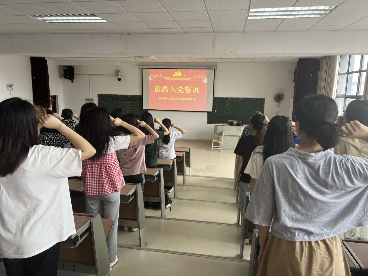 “青春向党,踔厉奋发”专题教育组织生活会安排了入党宣誓和重温誓词环节。周艳红带领毕业生新老党员庄严宣誓和重温入党誓词,以提醒毕业生党员毕业后无论身在何处,都应铭记入党时的初心、宣誓时内心热烈滚烫的信仰。铿锵有力的入党誓言,表达了外国语学院学子身为新时代党员对党忠诚、永不叛党的坚定信念,更表达了全心全意为人民服务、为实现中华民族伟大复兴的中国梦踔厉奋发的责任和担当。