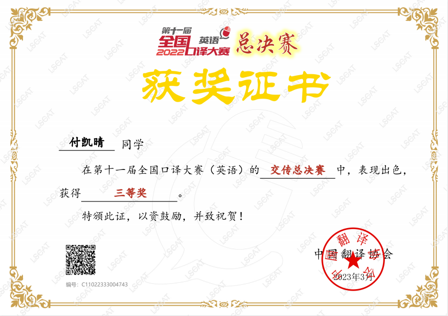 近日,第十一届全国口译大赛全国总决赛落幕。开元官网2019级商务英语专业学生付凯晴在第十一届全国口译大赛(英语)的交传总决赛中获得三等奖,专业老师陈柯老师获优秀指导教师奖。这是开元官网师生首次晋级全国总决赛并获得优异成绩。