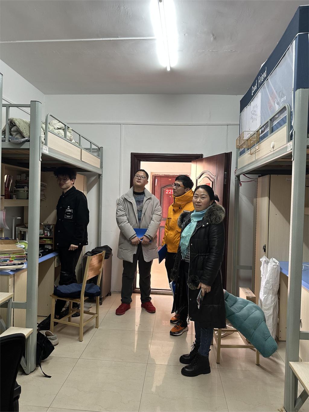 走访过程中,学院领导和老师向同学们致以新年祝福,与大家进行亲切交流,关切询问他们的假期生活、学习情况。借此机会刘斌嘱咐同学们做到:严格遵守宿舍安全管理规定,保持宿舍环境干净整洁,营造良好的学习生活氛围;及时调整心态,归心学习,充分应对期末考试;提高思想认识,将小我融入大湖工,以积极饱满的精神面貌迎接评估。