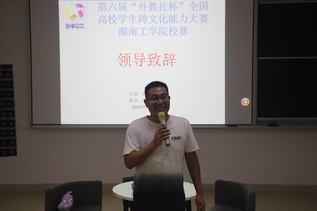 赛前,任长安发表了指导讲话。首先,他对大赛的筹备工作表示肯定。随后指出教务处对各类学科竞赛支持力度不断加大,鼓励师生们踊跃参赛;最后他对学生提出两点希望。第一,新一代大学生是中国特色社会主义建设的接班人,参加跨文化能力大赛,讲好中国故事、湖南故事意义重大。第二,希望同学们通过比赛,夯实英语学科基础,提升外语交流和跨文化交际能力,开阔眼界,拓宽视野。