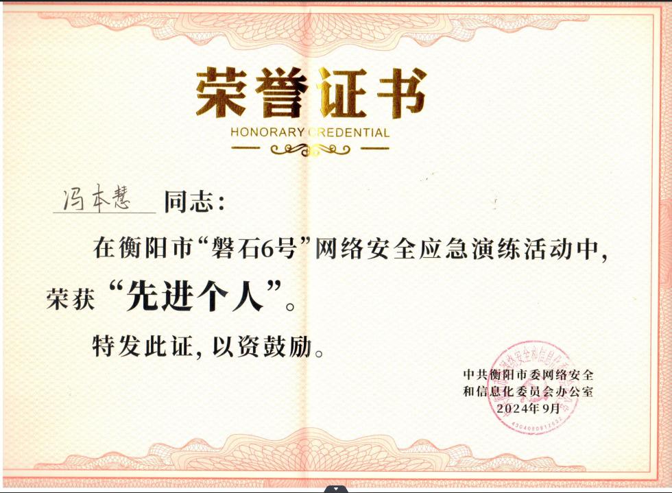 开元官网冯本慧老师因其在应急演练中的良好表现,获得了衡阳市”磐石6号”网络安全应急演练先进个人的荣誉称号。(图文:冯本慧一审:唐杰二审:贾东风三审:黎昂)