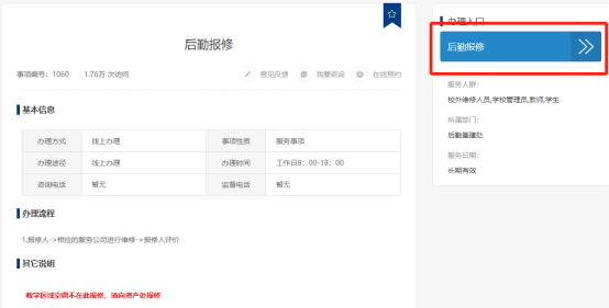 ① 申请:申请人按照上面的步骤登录一网通办服务平台后,如下图,点击左侧“后勤基建处”,再点击右侧“后勤报修”