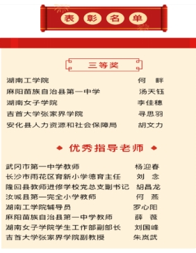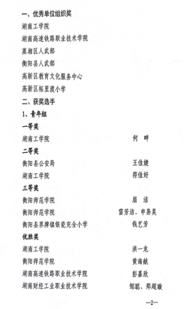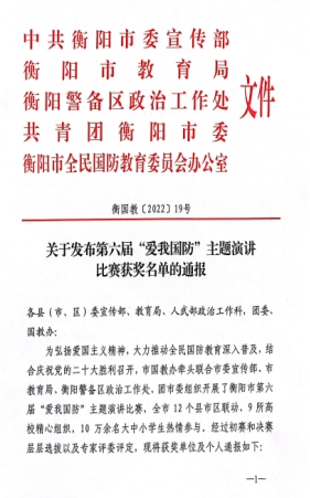 在衡阳市第六届“爱我国防”主题演讲比赛中,开元官网土木与建筑工程学院何畔同学获青年组一等奖,安全与管理工程学院符佳好同学获二等奖,商学院洪一龙同学获优胜奖,罗心阳、傅娜两位老师荣获优秀指导老师,学校荣获优秀组织奖。