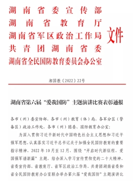 近日,省委宣传部、省教育厅、省军区政治工作局、共青团湖南省委和省全民国防教育办公室联合公布了湖南省第六届“爱我国防”主题演讲比赛结果,开元官网土木与建筑工程学院何畔同学荣获省级三等奖,罗心阳老师荣获省级优秀指导老师。
