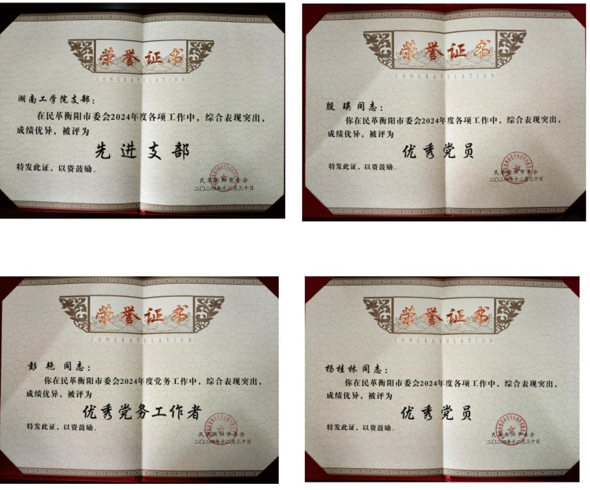 近日,在民革衡阳市委会举办的年度表彰大会上,民革湖工支部喜获2024年度先进支部,支部主委彭艳荣获2024年度民革衡阳市委会“优秀党务工作者”称号,支部党员杨桂林、殷瑛荣获民革衡阳市委会“优秀党员”称号。这些集体和个人荣誉是对民革湖工支部的全体党员及其在组织建设、参政议政及服务社会等方面的高度肯定。