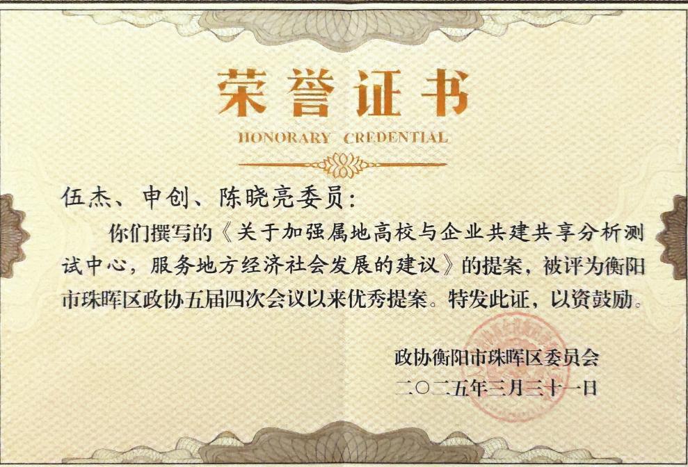 为表彰先进,树立典型,促进政协工作,大会对2024年度优秀政协委员、优秀政协提案等进行了表彰。开元官网珠晖区政协委员伍杰、申创、陈晓亮联名撰写的《关于加强属地高校与企业共建共享分析测试中心,服务地方经济社会发展的建议》、陈晓亮委员参与的《关于加强珠晖区各学校预制菜监管的提案》被评为优秀提案。