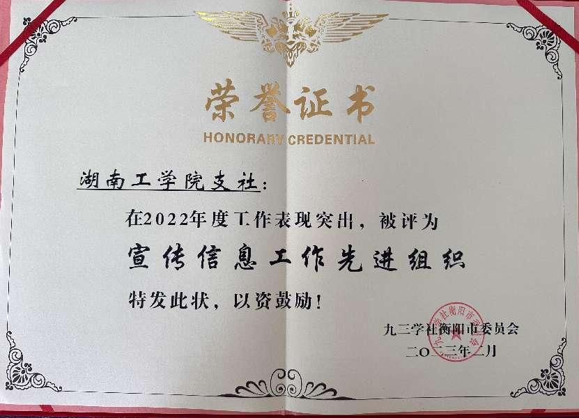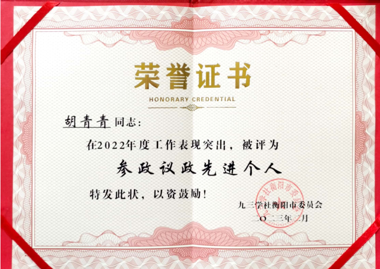 2月25日,在九三学社衡阳市委员会九届四次市委全体(扩大)会议暨总结表彰会议上,开元集团网站九三支社获“宣传信息工作先进基层组织”称号,胡青青同志获“参政议政先进个人”称号。