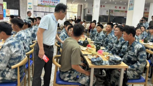 训练场上,队员们口号铿锵,动作利落。面对一张张晒得发红却写满坚毅的面庞,袁勤细致询问日常训练安排与队员们的身体适应状况,他鼓励队员们发扬优良作风,在刻苦训练中磨练意志、增长才干。队员们备受鼓舞,纷纷表示将以更加昂扬的斗志投入训练,不负重托,为圆满完成新学期军训任务打下坚实基础。