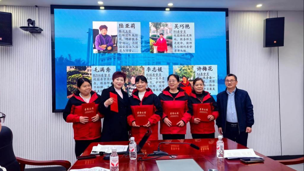会上,学生工作部部长曹毅向全体房管员就一年以来的日常巡查、安全维护、服务响应、矛盾协调、应急处理等工作表示诚挚的感谢。会议对陆亚莉、吴巧艳、毛满秀、李志媛、许梅花等五位表现突出的房管员进行了表彰,肯定她们在岗位上的坚守与奉献。