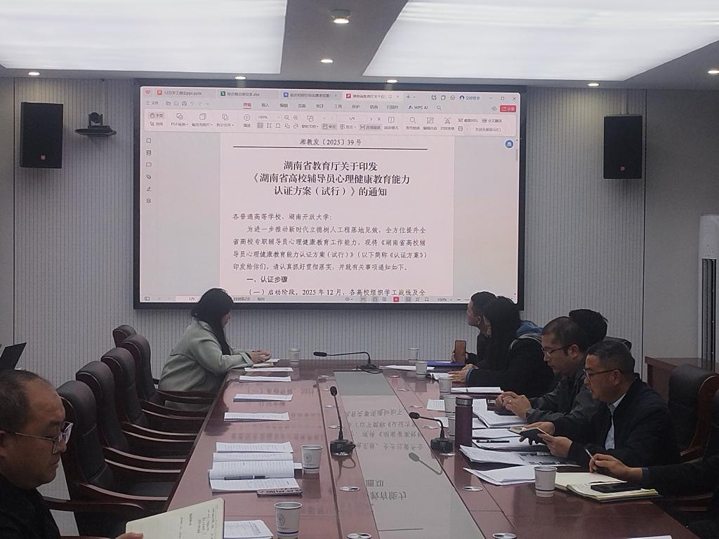 近日,湖南省教育厅正式发布《湖南省高校辅导员心理健康教育能力认证方案(试行)》,依托国家级继续教育基地平台,在全省范围内启动高校专职辅导员心理健康教育能力分级认证。2025年12月4日,学生工作部组织各二级学院党委副书记、学工办主任在一站式社区服务中心会议室开展专题学习,由学生工作部部长曹毅深度解读文件精神,为认证工作在学校的全面推进奠定基础。