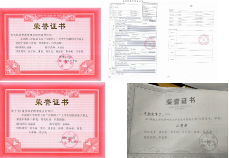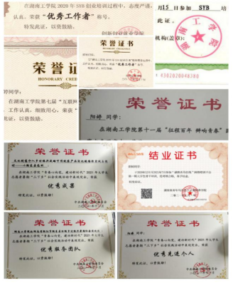 在校期间获得校级一等奖奖学金和“三好学生”的称号。在学习专业知识的同时积极参加各种学科类竞赛活动,2021年5月,在“开元集团网站第四届大学生电子商务大赛”主赛道中荣获“二等奖”。同年7月,参加了“第七届湖南省互联网+大学生创新创业大赛”,以项目“电气机房智慧管理系统的设计”和“基于5G通信的护眼智能台灯”在主赛道中分别荣获校级二等奖,并在指导老师的带领下参与实用型专利申请并成为“显示器支架”发明人之一。