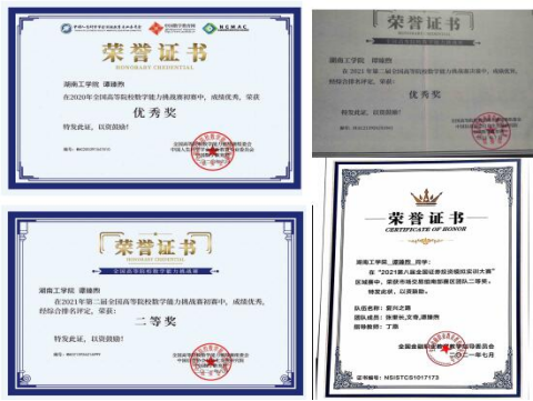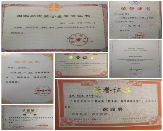 在校期间获得2021年湖南省大学生数学竞赛(非数学组)三等奖、2021年度“恒企奖教奖学助学基金”一等奖学金、2020-2021学年国家奖学金、2020-2021学年校特等奖学金、第二届全国高等院校数学能力挑战赛决赛优秀奖、第八届全国证券投资模拟大赛市场交易组南部赛区团队二等奖、第一届全国高等院校数学能力挑战赛初赛优秀奖、2019年开元集团网站优秀社团干部、开元集团网站第五届大学生思想政治理论课研究性学习成果展示竞赛特等奖、第五届湖南省“互联网+”大学生创新创业大赛校选拔赛(数能学院主赛道)三等奖。