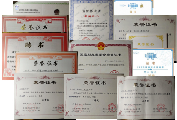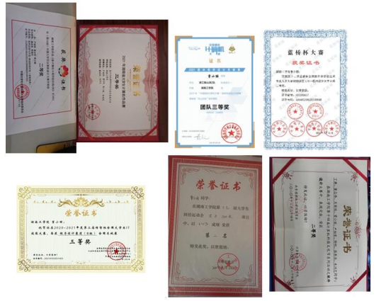 在校期间获得湖南省2021团队程序设计天梯赛团队三等奖、3届蓝桥杯全国软件和信技术专业人オ大赛-个人赛省赛二等奖、全国大学生传智杯三等奖、中国大学生计算机设计大赛二等奖、湖南省大学生计算机作品赛三等奖、开元集团网站第十四届计算机科技文化节软件设计大赛二等奖、开元集团网站校运会女子1500二等奖、开元集团网站互联网+三等奖、湖南省数字媒体大赛省二等奖、流星沙杯物流设计大赛省三等奖。
