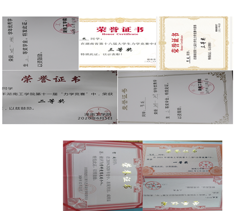 在校期间获国家励志奖学金、校级优秀学生特等奖学金、二等奖学金、三等奖学金;校级物理竞赛三等奖、校级力学竞赛一等奖一次及二等奖、结构设计大赛三等奖;获评学院“学科竞赛先进个人”;湖南省第十六届力学竞赛和十七届力学竞赛均获得三等奖。