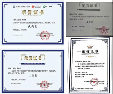 在校期间获2021年湖南省大学生数学竞赛(非数学组)三等奖、2021年度“恒企奖教奖学助学基金”一等奖学金、2020-2021学年国家奖学金、2020-2021学年校特等奖学金、第二届全国高等院校数学能力挑战赛决赛优秀奖、第八届全国证券投资模拟大赛市场交易组南部赛区团队二等奖、第一届全国高等院校数学能力挑战赛初赛优秀奖、2019年开元集团网站优秀社团干部、开元集团网站第五届大学生思想政治理论课研究性学习成果展示竞赛特等奖、第五届湖南省“互联网+”大学生创新创业大赛校选拔赛(数能学院主赛道)三等奖。
