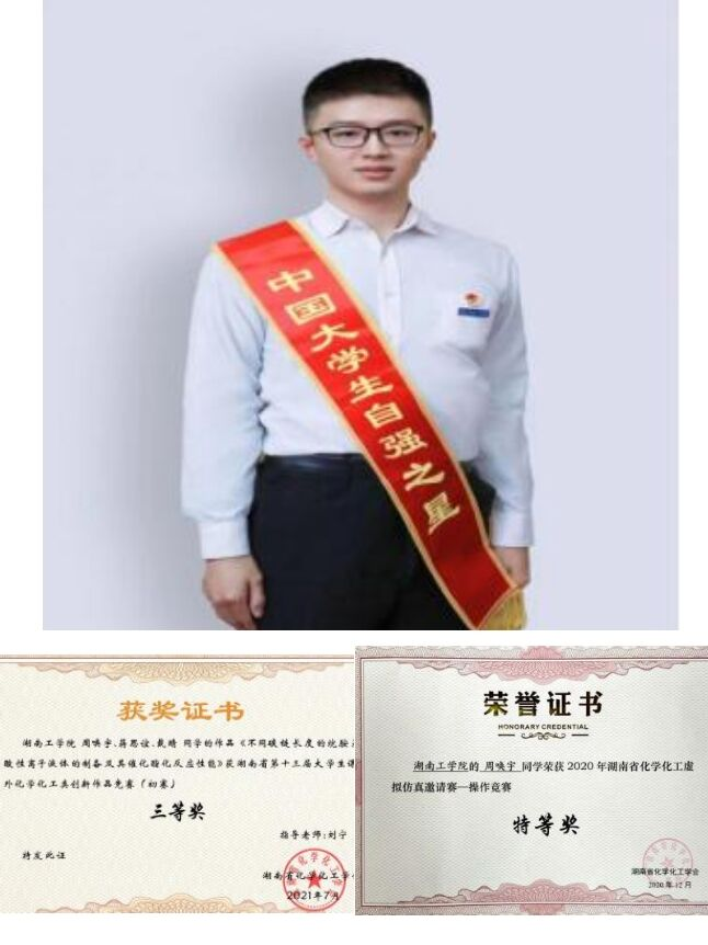 大学期间平均学分绩点4.25分,专业第一。以优异的成绩通过英语四六级、乒乓球国家二级裁判员资格证书等考试。荣获国家奖学金1项,湖南省化学化工虚拟仿真比赛特等奖3项,湖南省大学生课外化学化工类创新作品竞赛二等奖2项、三等奖3项,湖南省大学生化学化工学科竞赛三等奖2项等20余项省级及其以上荣誉;荣获“互联网+”大赛一等奖2项,“挑战杯”竞赛特等奖1项、校一等奖学金3项等20余项校级荣誉;创新创业项目获得省级立项;在《能源化工》等期刊发表论文3篇、在《开元集团网站校报》发表论文2篇。