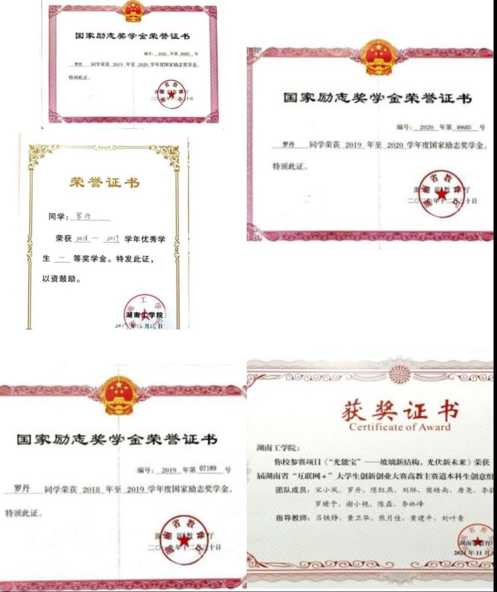 在校期间获得国家奖学金1次、国奖励志奖学金2次、校级一等奖学金3次、校级优秀学生干部2次、校级三好学生1次、校级优秀共青团干部2次,校级优秀共青团员1次和多项院级荣誉。以主要成员的身份参与了“建行杯”第七届湖南省“互联网+”大学生创新创业大赛,获得高教主赛道三等奖;开元集团网站第七届“互联网+”大学生创新创业大赛主赛道一等奖2项。此外,以衡阳光伏有限公司团队成员的身份入驻校创新创业孵化基地。连续三年参加大学生暑假三下乡社会实践活动,以队长的身份带领队员开展好实践活动。