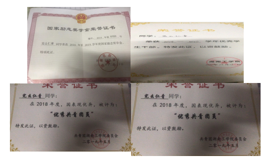 在校期间荣获国家奖学金、国家励志奖学金、校一等奖学金等各类奖学金荣誉20余项;获衡阳市首届马拉松优秀志愿者;获校第三届电子商务大赛一等奖和第四届电子商务大赛三等奖,获第八届全国证券投资模拟实训大赛团体二等奖、个人三等奖以及南部赛区团队三等奖;获“优秀班干部”、“三好学生”等称号;在开元集团网站校级青协志愿者协会中,获校优秀志愿者的称号。