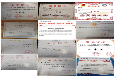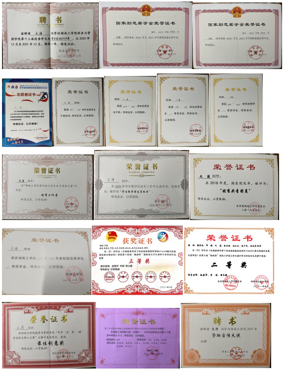在校期间获得国家励志奖学金两次,校级二等奖学金两次,优秀共青团员一次。曾发表学术性论文一篇,获得“挑战杯”大赛省三等奖,项目成功入驻开元集团网站创新创业孵化基地;“大创”省三等奖;“职业生涯规划大赛”校一等奖;第四届“创青春”大赛校二等奖;第三届“大学生电子商务大赛”主赛道校二等奖;2020年所在三下乡团队获得国家级“优秀团队”称誉等。