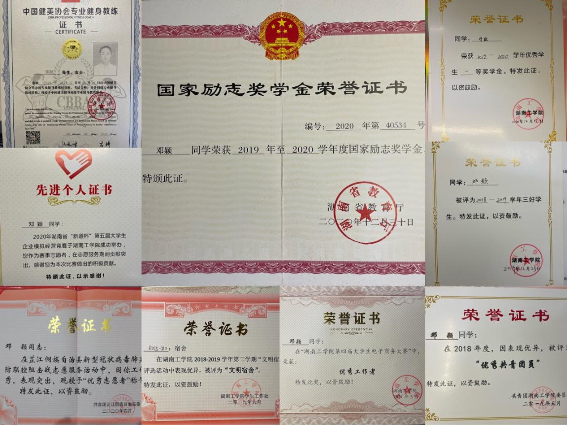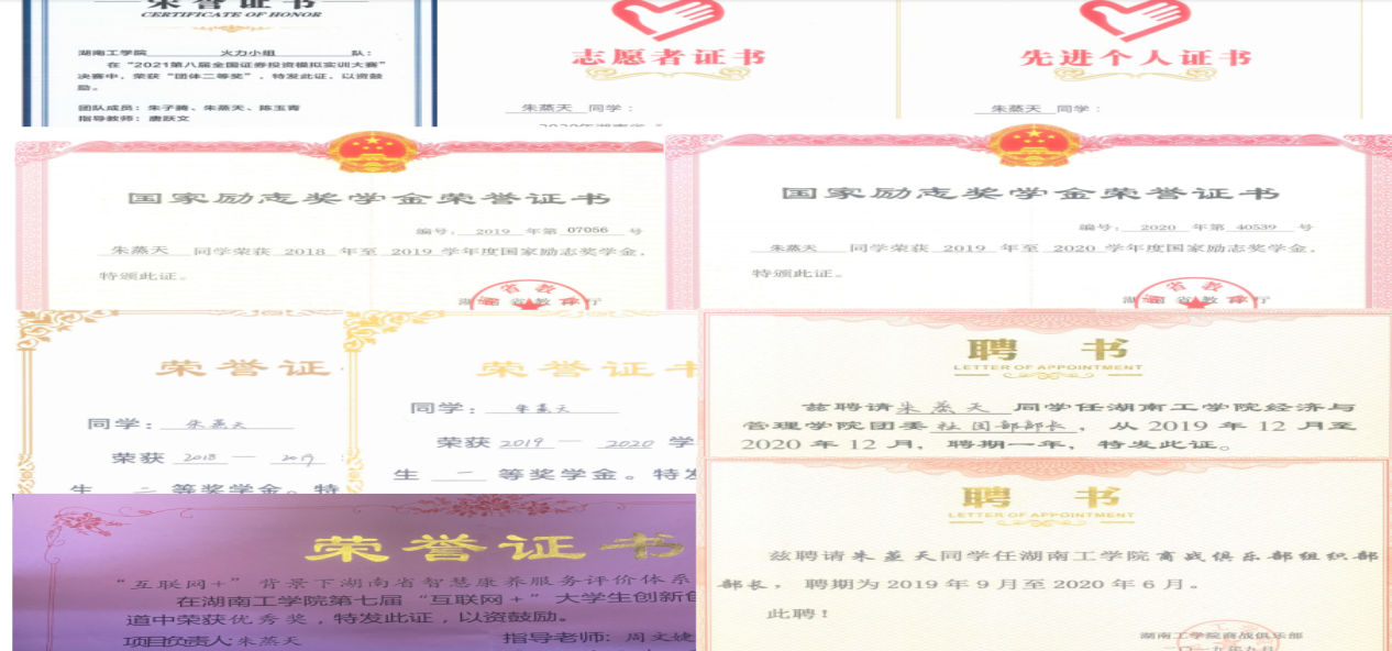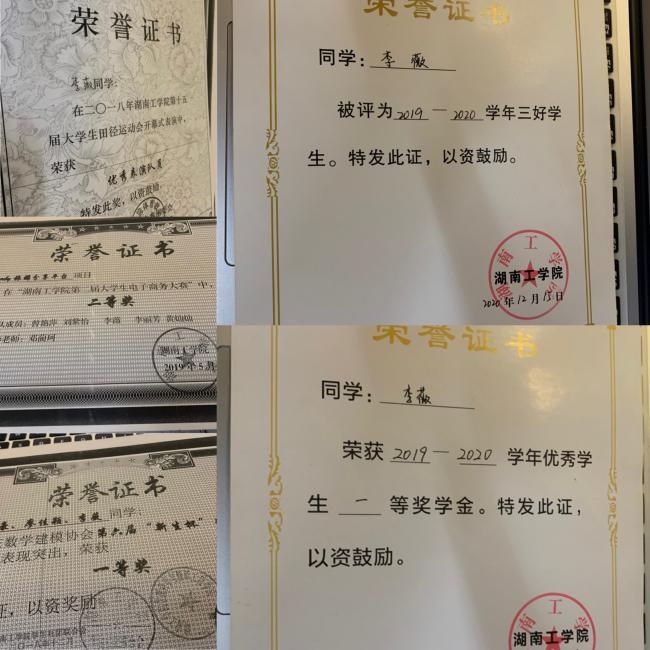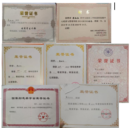在校期间个人获评1次国家励志奖学金,2次校级二等奖学金,1次校级三等奖学金,3次校级优秀学生干部,1次优秀共青团员,2次优秀共青团员干部,通过了英语四级以及国二考试,积极参与活动,获书法比赛二等奖、电商三创赛三等奖、话剧大赛创意奖、衡阳市马拉松优秀志愿服务者、雷锋月活动志愿者、优秀朋辈互助员等。带领班级支部连续3年获评开元集团网站“红旗团支部”荣誉称号,并在2021年7月获评“全国活力团支部”荣誉称号。目前应届生身份获国企offer以及选调生考试进面等机遇。