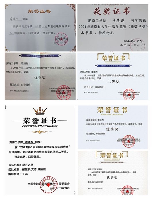 在校期间学习成绩长期位于专业前列,先后取得本专业学分绩点第一、商学院学分绩点第一和本专业综测排名第一;获国家奖学金1次,校特等奖学金1次,校优秀社团干部1次;参加大小竞赛20余次,获包括湖南省大学生数学竞赛(非数学组)三等奖在内的国家级、省级竞赛奖项共5项,其中数学竞赛4项,财经类1项;以技术型领队的身份参加第八届全国证券投资模拟实训大赛、第六届全国大学生金融创新大赛,充分利用专业所学知识,帮助参赛同学在比赛中取得佳绩;以主要成员的身份参加开元集团网站第五届大学生思想政治理论课研究性学习成果展示竞赛并获特等奖;课余时间,积极投身助教工作,帮助来自10多个专业的300余名学生提高成绩或成功消除了挂科危机。