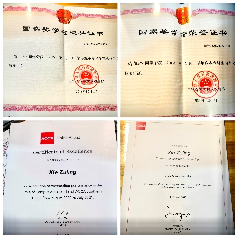 在校期间专业成绩和综合测评连续三年位于会计学专业第一。先后获得“2018-2019年度、2019-2020年度国家奖学金”以及2021年度“恒企奖教奖学助学基金”一等奖学金,并连续三年获“校级一等奖学金”、“校级三好学生”、“ACCA专项一等奖学金”,连续两年获“校级三好学生标兵”等四十余项荣誉。此外,带领班级获全国高校“活力团支部”荣誉称号,并连续三年获“五四红旗团支部”和“先进班集体”。在活动和竞赛中获“2021年ACCA全国就业力大比拼优胜奖”、“2021年度ACCA全国优秀校园大使”、“第四届创青春创业大赛二等奖”、“衡阳市环城跑三等奖”等多项奖项。